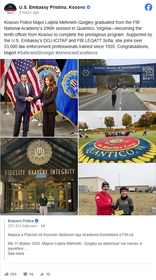 Ambasada e Shteteve të Bashkuara të Amerikës në Kosovë ka përgëzuar Majoren e Policisë së Kosovës, Luljeta Mehmeti–Quigley, për përfundimin me sukses të sesionit të 296-të të Akademisë Kombëtare të FBI-së në Quantico, Virxhinia.