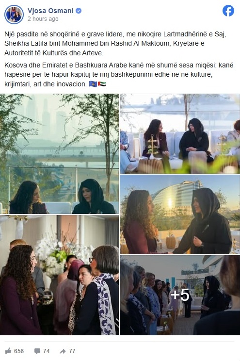 Presidentja e Republikës së Kosovës, Vjosa Osmani, është takuar me kryetaren e Autoritetit të Kulturës dhe Arteve, Sheikha Latifa bin Mohammed bin Rashid Al Maktoum.