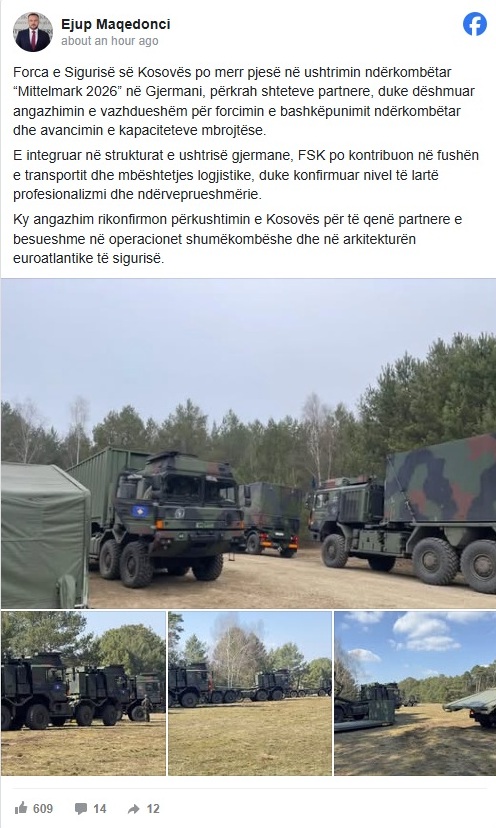 Ministri i Mbrojtjes, Ejup Maqedonci, ka bërë të ditur se Forca e Sigurisë së Kosovës po merr pjesë në ushtrimin ndërkombëtar “Mittelmark 2026” në Gjermani, përkrah shteteve partnere, duke dëshmuar angazhimin e vazhdueshëm për forcimin e bashkëpunimit ndërkombëtar dhe avancimin e kapaciteteve mbrojtëse.
