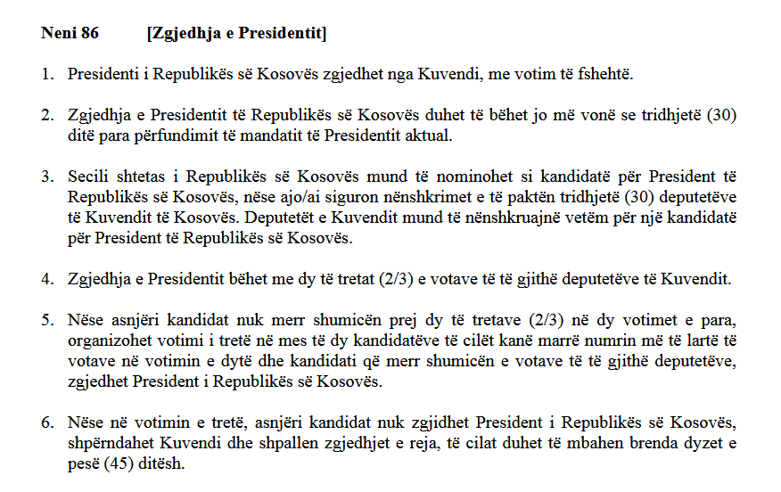 Kushtetuta e Kosovës thotë se zgjedhja e presidentit të Republikës duhet të bëhet jo më vonë se tridhjetë ditë para përfundimit të mandatit të presidentit aktual.