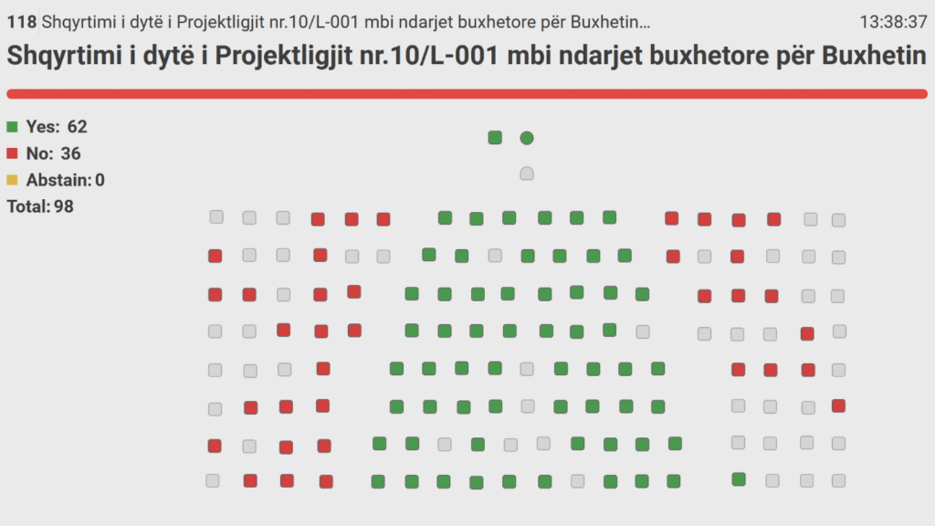 Me 62 vota për dhe 36 kundër, deputetët e Kuvendit të Kosovës miratuan buxhetin në lexim të dytë për vitin 2026, transmeton IndeksOnline.