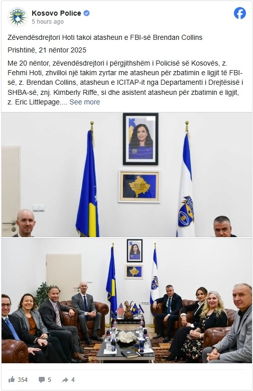 Zëvendësdrejtori i përgjithshëm i Policisë së Kosovës, Fehmi Hoti, ka zhvilluar një takim zyrtar me atasheun për zbatimin e ligjit të FBI-së, Brendan Collins.