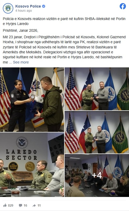 “Kjo vizitë historike shënoi herën e parë që zyrtarë të Policisë së Kosovës kanë vëzhguar drejtpërdrejt procedurat operative në disa pika të kalimit kufitar SHBA–Meksikë. Delegacioni shprehu vlerësim të lartë për mundësinë për t’u njohur nga afër me praktikat e sofistikuara të CBP-së dhe Patrullës Kufitare të menaxhimit kufitar, përdorimin e teknologjive moderne dhe qasjet e koordinuara të zbatimit të ligjit të përdorura në një nga pikat më të ngarkuara të hyrjes në Shtetet e Bashkuara”, bëhet e ditur në njoftim.