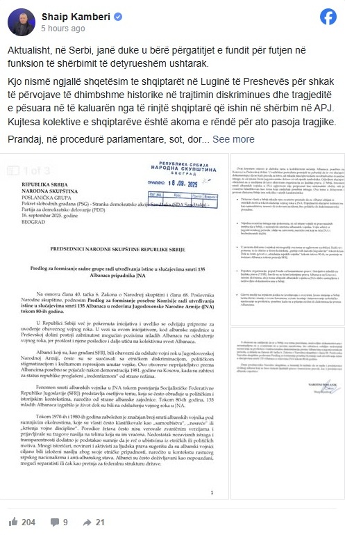 Shërbimi i detyrueshëm ushtarak në Serbi, Kamberi shpreh shqetësimin e shqiptarëve të Luginës së Preshevës 17.09.2025 | 02:45