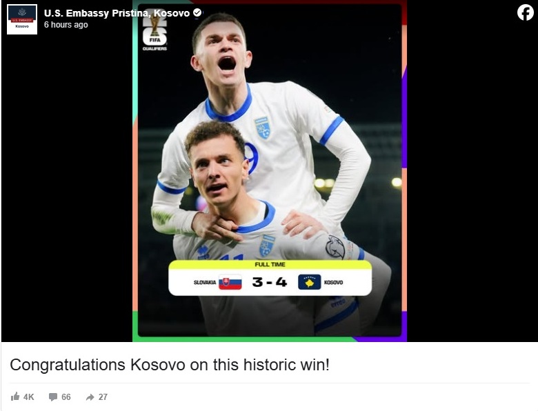 Ambasada e Shteteve të Bashkuara të Amerikës në Kosovë e ka uruar Kosovën për fitoren e mbrëmshme ndaj Sllovakisë dhe kualifikimin për finale në play-off për Kupën e Botës.